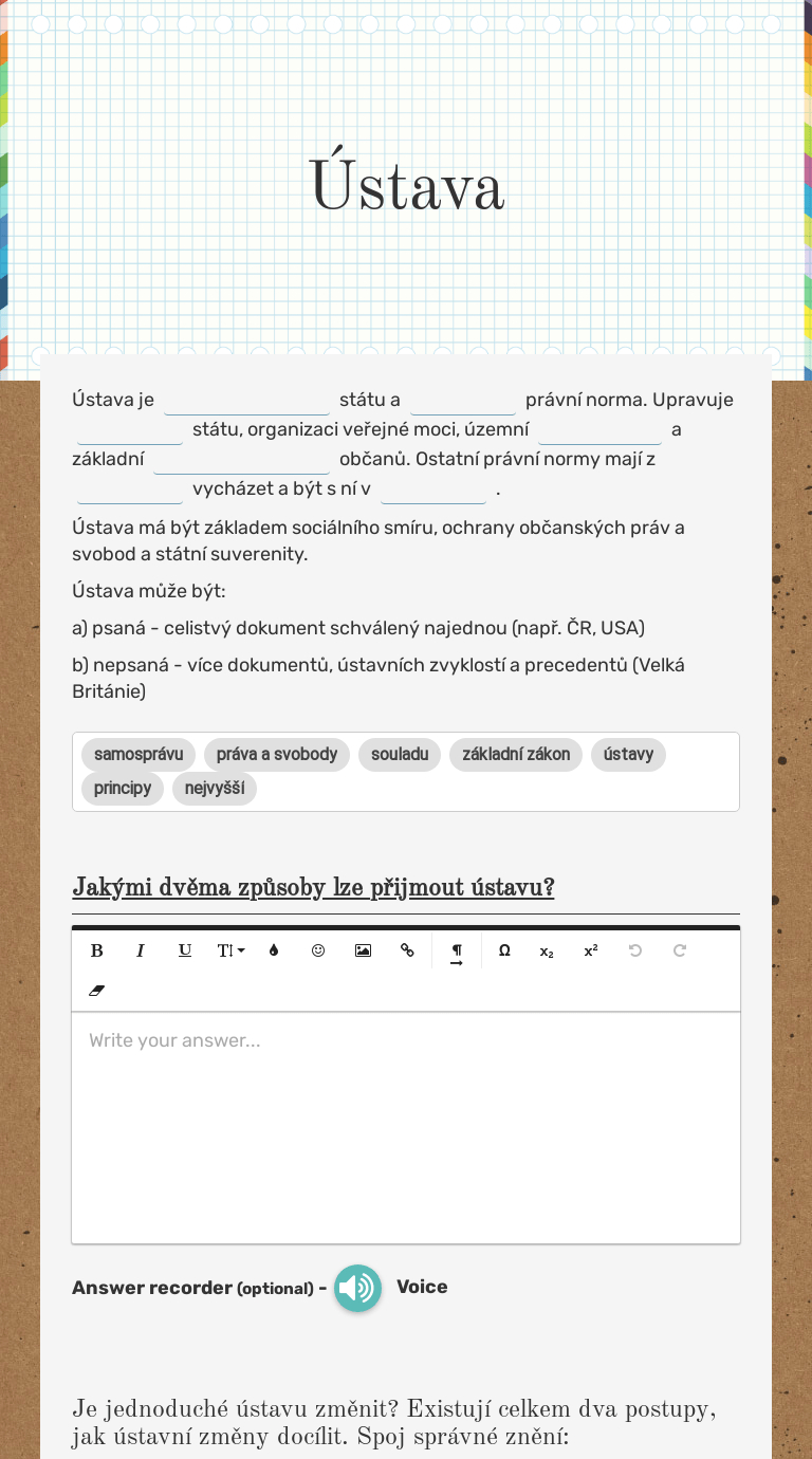 Česká národní rada se usnesla na tomto ústavním zákoně: Ústava české republiky byla přijata českou národní radou dne 16. 1992, když slovenská národní rada přijala deklaraci o svrchovanosti slovenské republiky, a pokračoval přijetím ústavy slovenské republiky dne 1. My, občané české republiky v čechách, na moravě a ve slezsku, v čase obnovy samostatného českého státu, věrni všem dobrým tradicím dávné státnosti zemí koruny české i státnosti československé, odhodláni budovat, chránit a rozvíjet českou republiku v duchu nedotknutelných hodnot lidské důstojnosti a svobody jako vlast rovnoprávných... Česká národní rada se usnesla na tomto ústavním zákoně preambule my, občané české republiky v čechách, na moravě a ve slezsku, v čase obnovy.